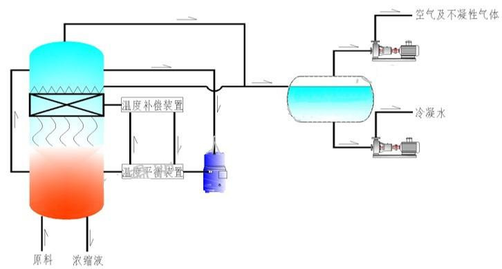 低温蒸发结晶器的原理是物料的沸点随着压强的降低而降低。低温节能浓缩设备整体保持真空状态,蒸发室的真空度约为95%~97%,在此压强下水的沸点为35℃~37℃,系统无需配备进料泵,利用蒸发室的负压将物料吸进蒸发室,通过强制循环方式将物料循环雾化,传输至换热器上,物料中水分被蒸发,物料连续循环雾化,通过蒸发室液位自动补料,浓度达到要求后作为浓缩液排出设备。浓缩液一般粘度较大,需采用泵抽出。